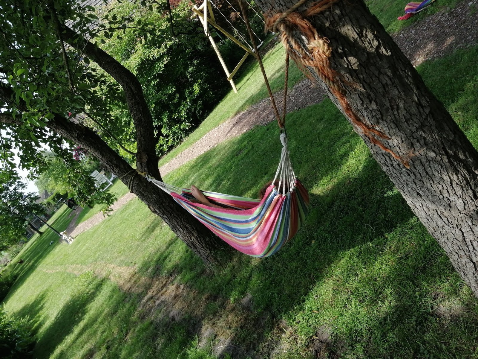 3. Dit soort hangmatten vind ik nooit fijn. Een "echte" hangmat, daar lig je dwars in, dat schommelt veel fijner en daar val je ook niet uit als je een beetje wild schommelt. Ik weet niet wie ooit op het idee is gekomen om in zo'n smalle hangmat te gaan liggen… Ik denk dat het te maken heeft met minder materiaal en dus goedkoper? Ik zou zeggen, probeer eens een keertje zo'n Mexicaanse hangmat, en je wil nooit meer wat anders. Die zijn ook veel luchtiger en je kan er met 2 tot 3 volwassenen in, is heel leuk, vroeger lag ik erin met minstens 3 kinderen tegelijkertijd.
