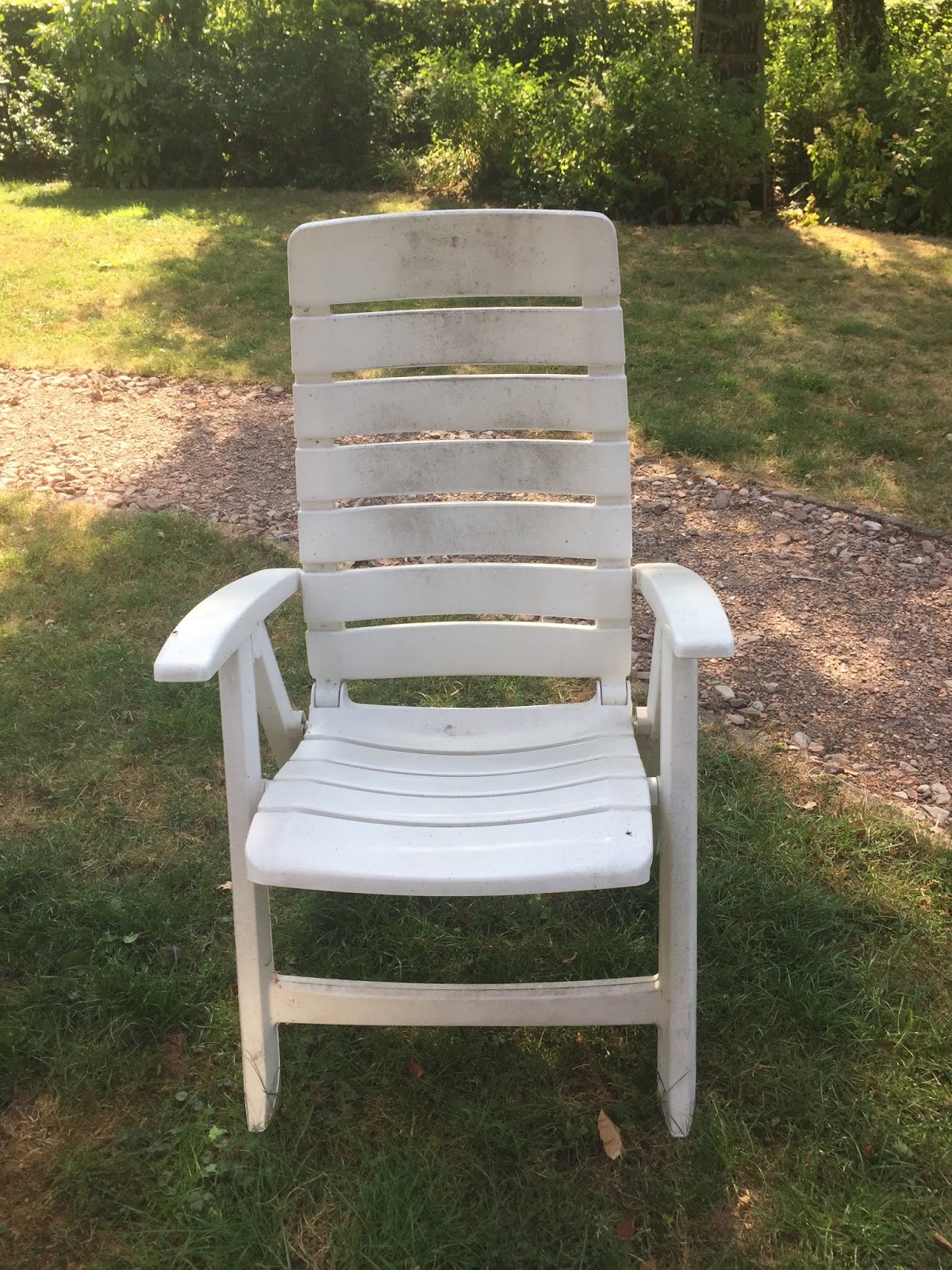 Bij de kringloop kocht ik voor een habbekrats witte kunststoffen tuinstoelen. Ze zagen er nog best redelijk goed uit. Maar er zaten wel behoorlijk wat grijs-zwarte vlekken in.