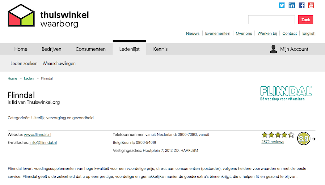 Laten we de proef eens op de som nemen, en een webshop controleren op keurmerk. Ik kies voor online shop Flinndal. In deze winkel kun je onder andere vitaminen kopen.