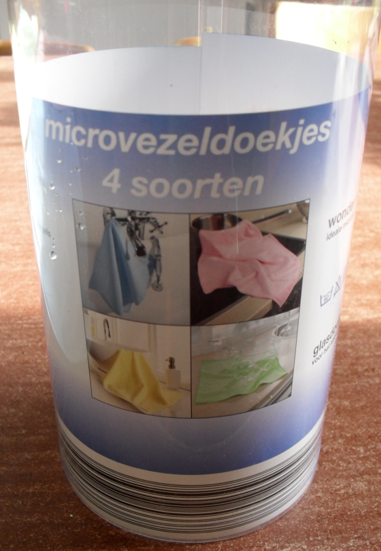 Bij de Aldi kocht ik een cilindervormige doos, met 4 microvezeldoekjes. Doekjes heb je immers niet gauw genoeg!