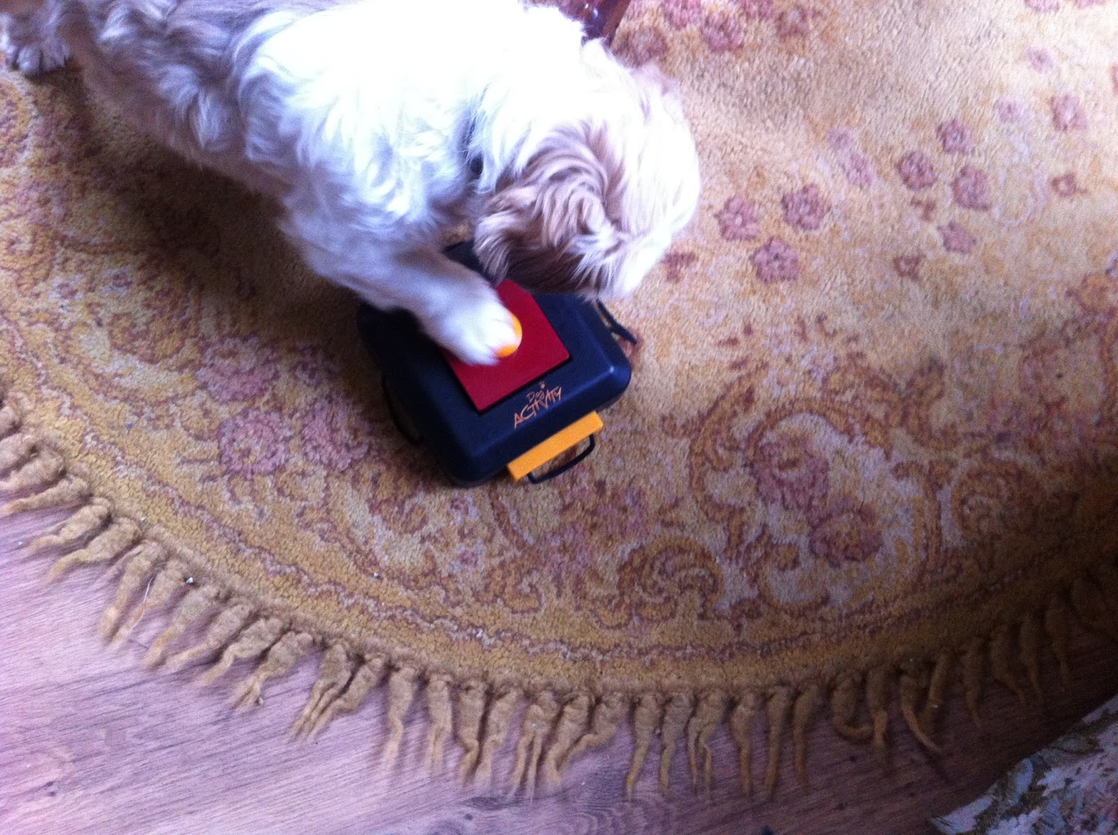 Het is echt superleuk om te zien. De laatjes vind ze iets moeilijker, maar kan ze ook. Ik had gedacht dat ze het dekseltje met haar mond zou oppakken, maar ze gebruikt hier voor dus haar poot.